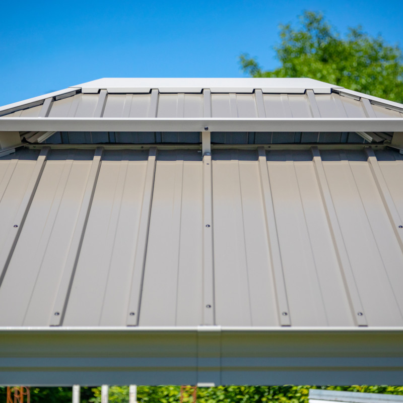 Cette magnifique pergola autoportante Messina couvre plus de 10m² pour accueillir un salon de jardin ou pourquoi pas un spa ou un jacuzzi. Elle est réalisée en aluminium pour la structure et en acier galvanisé pour la double toiture.